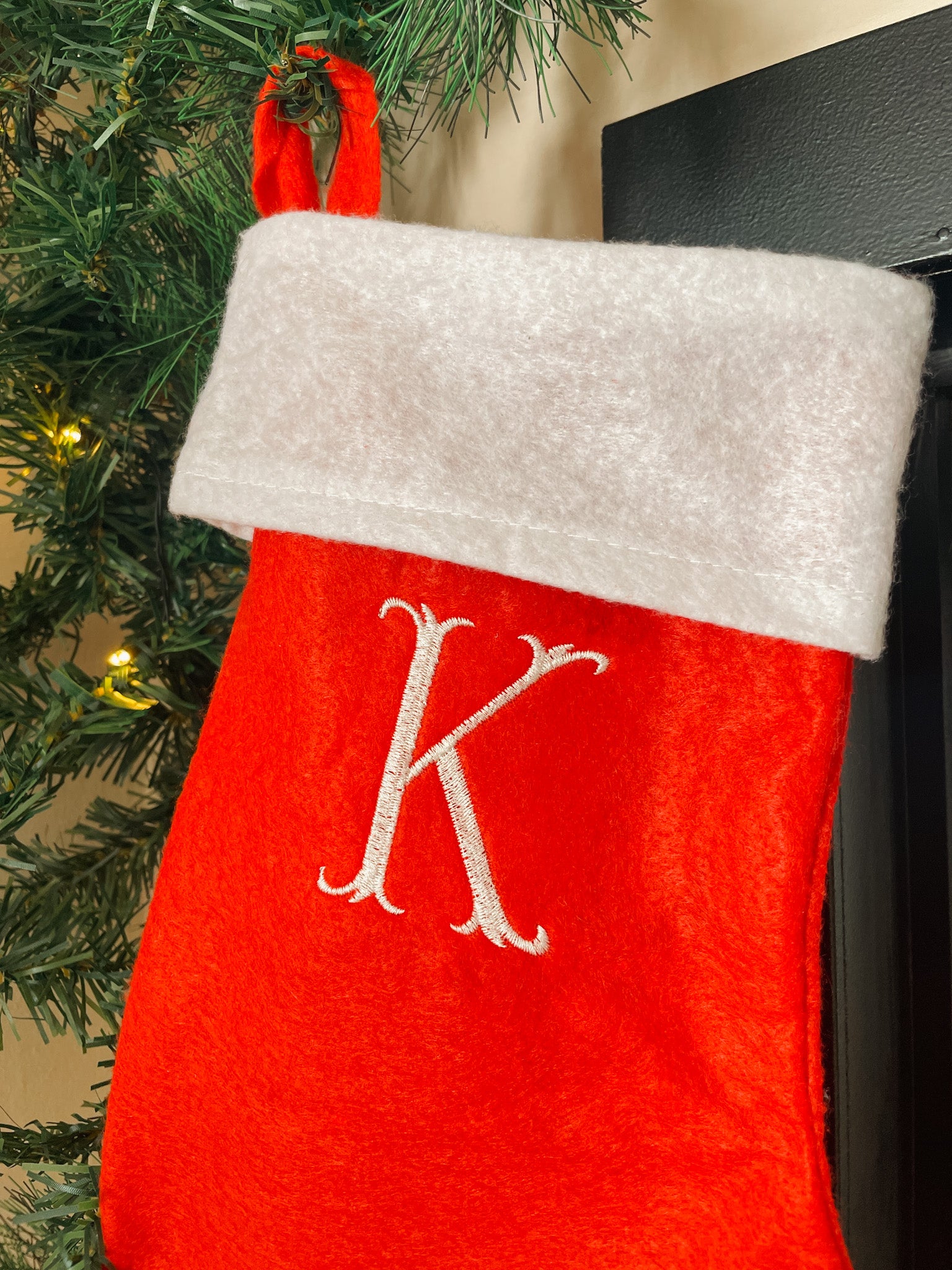 Een zachte kerstsok met geborduurde initiaal – klaar om met liefde gevuld te worden.